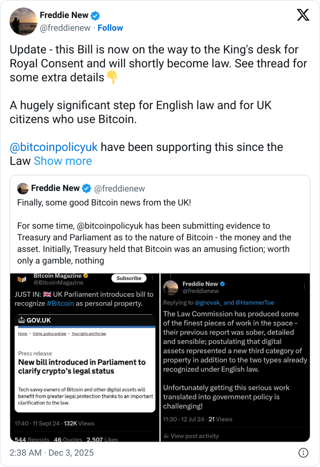 Фредди Нью, руководитель политики в адвокационной группе Bitcoin Policy UK, заявил на платформе X, что превращение законопроекта в закон является огромным шагом вперед для Биткойна в Великобритании и для всех, кто его здесь держит и использует.
