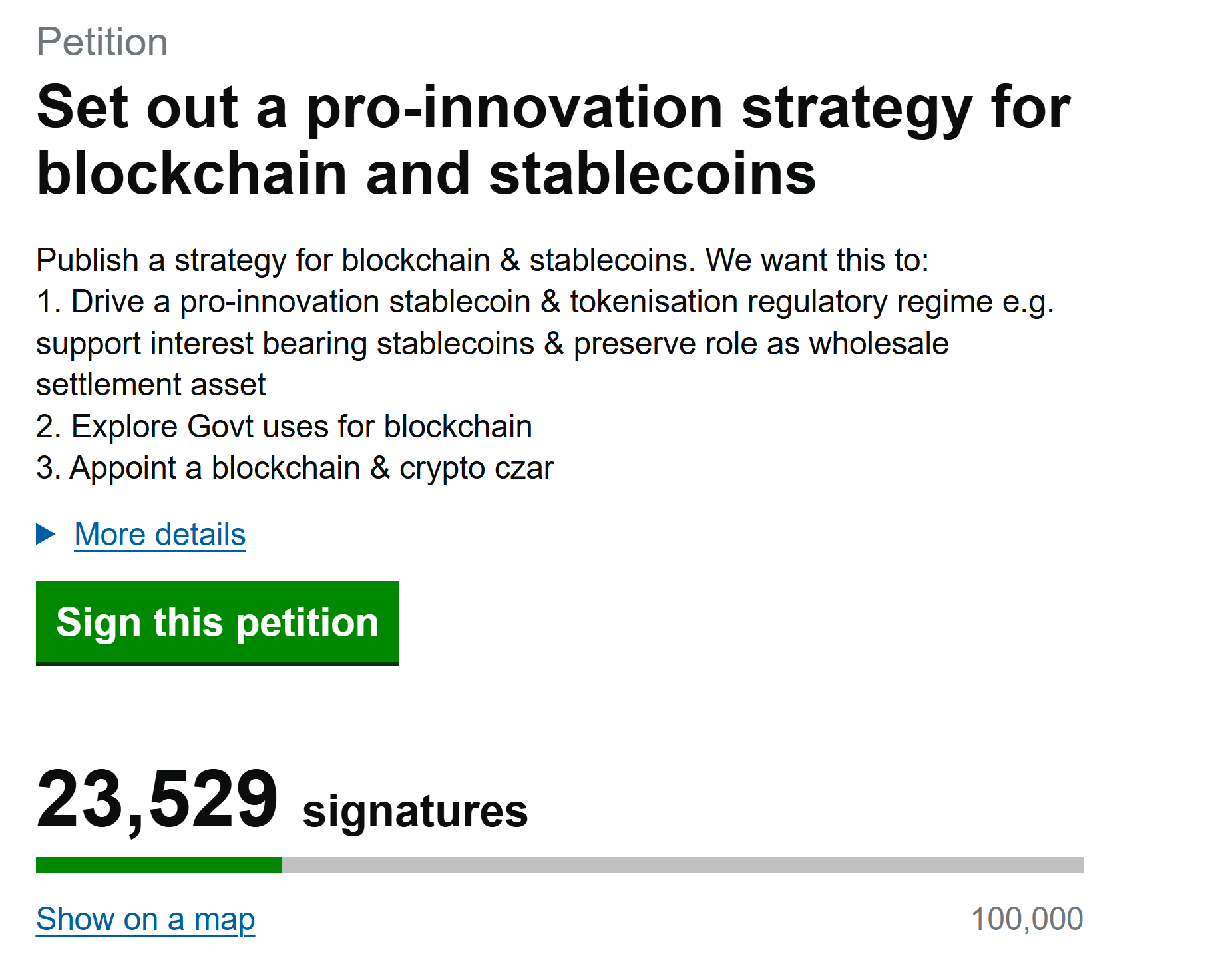 В прошлом месяце Coinbase призвал пользователей поддержать публичную петицию с призывом к Великобритании разработать стратегию, направленную на инновации в области блокчейна и стабильных криптовалют. Петиция включала требования регулирования стабильных монет и токенизации, принятия блокчейна и назначения «координатора» по блокчейну.