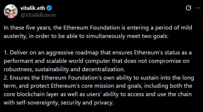 В публикации в X он уточнил, что средства выведены из его личных активов и будут распределяться в течение ближайших нескольких лет. По его словам, это соответствует более широкому сдвигу на фоне того, что Ethereum Foundation входит в период «умеренной экономии», при сохранении амбициозной технической дорожной карты.