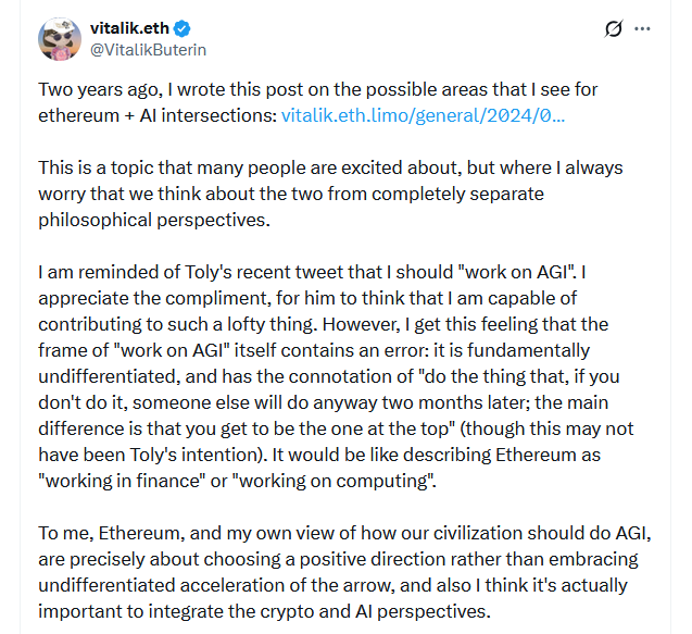 Он выделил четыре направления, где Ethereum и ИИ могут пересечься в обозримом будущем: создание бездоверительных и/или приватных взаимодействий с ИИ, превращение Ethereum в экономический слой для взаимодействий «ИИ—ИИ», использование ИИ для проверки всего происходящего ончейн и повышение эффективности рынков и управления.