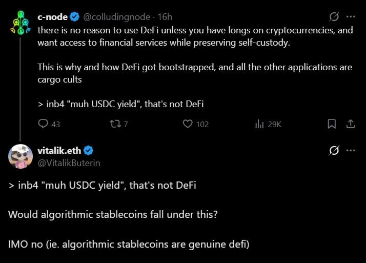 В обсуждении в X Бутерин заявил, что ценность DeFi заключается в том, что он по-новому распределяет и управляет риском, а не просто генерирует доходность на централизованных активах.