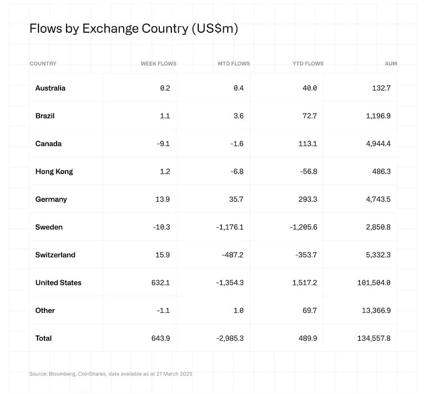 Канада и Швеция лидируют по оттокам. Источник: CoinShares