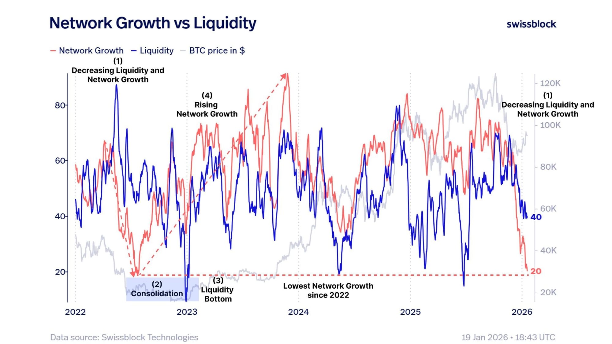 Аналитики Swissblock заявили, что снижение роста сети биткойна и недавний отток ликвидности напоминают условия, наблюдаемые в 2022 году.