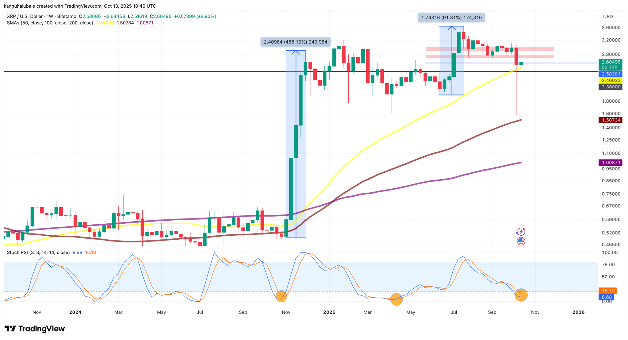 «Еженедельный Stoch RSI XRP вновь достиг уровней перепроданности, что указывает на сильный бычий разворот», — заявил аналитик Chart Nerd в посте на X в пятницу, добавив: