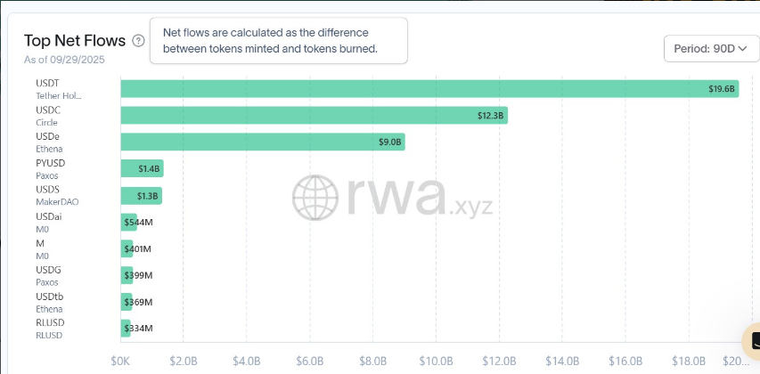 Несмотря на растущую конкуренцию, USDt от Tether и USDC от Circle продолжают лидировать на рынке. USDt зафиксировал $19,6 миллиарда чистых притоков в третьем квартале, за ним следуют USDC с $12,3 миллиарда и Ethena's USDe с $9 миллиардами, по данным отрасли.