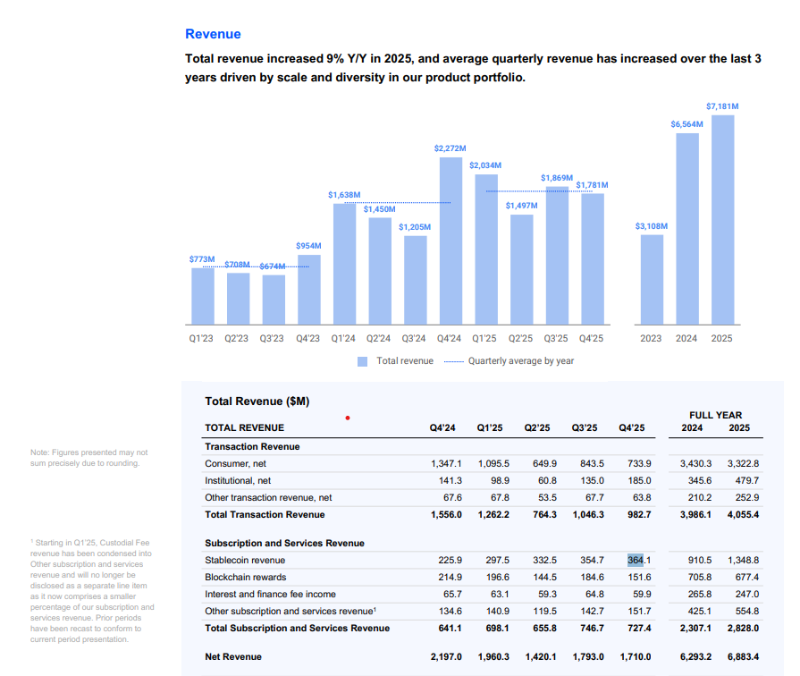 Это больше, чем $911 млн в 2024 году: только в Q4 2025 стейблкоин-направление принесло $364 млн. Существенную роль сыграли процентные доходы по остаткам USDC — для биржи это высокомаржинальная статья по сравнению с нестабильными торговыми комиссиями.