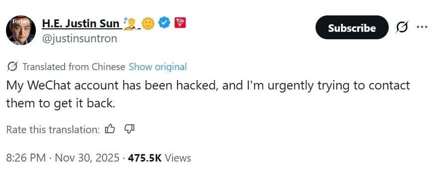 Это произошло после предыдущего взлома WeChat в ноябре, в который был вовлечен основатель Tron Джастин Сан. 30 ноября Сан написал в X, что его аккаунт был взломан и что он связался с платформой, чтобы попытаться вернуть его.
