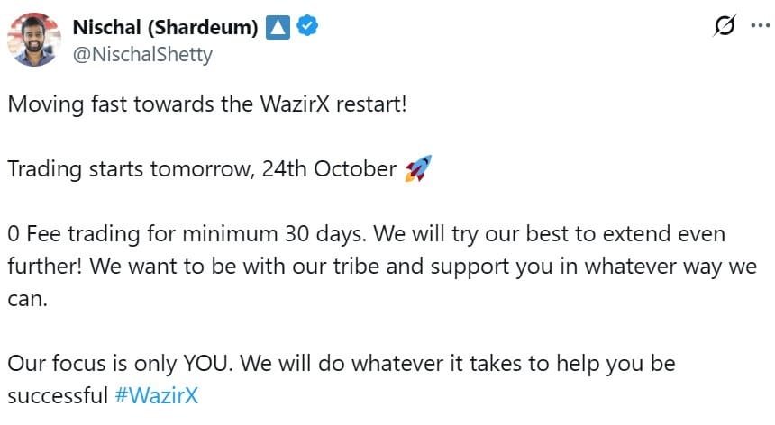 Генеральный директор WazirX Нишал Шетти сообщил в четверг, что компания возобновит торговлю в пятницу и предложит нулевые комиссии за торговлю минимум в течение 30 дней в рамках поэтапного перезапуска.