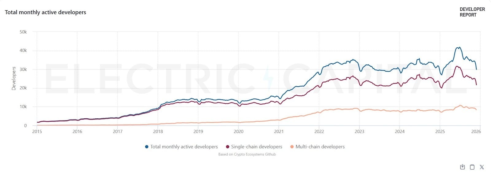 Активные разработчики оставались стабильными в 2025 году, но сменили свои приоритеты на долгосрочную перспективу. Согласно отчету разработчиков Electric Capital, количество штатных разработчиков криптовалюты — определяемых как те, кто вносит код не менее 10 дней в месяц — выросло на 5% в годовом исчислении, несмотря на некоторое снижение общего числа разработчиков.