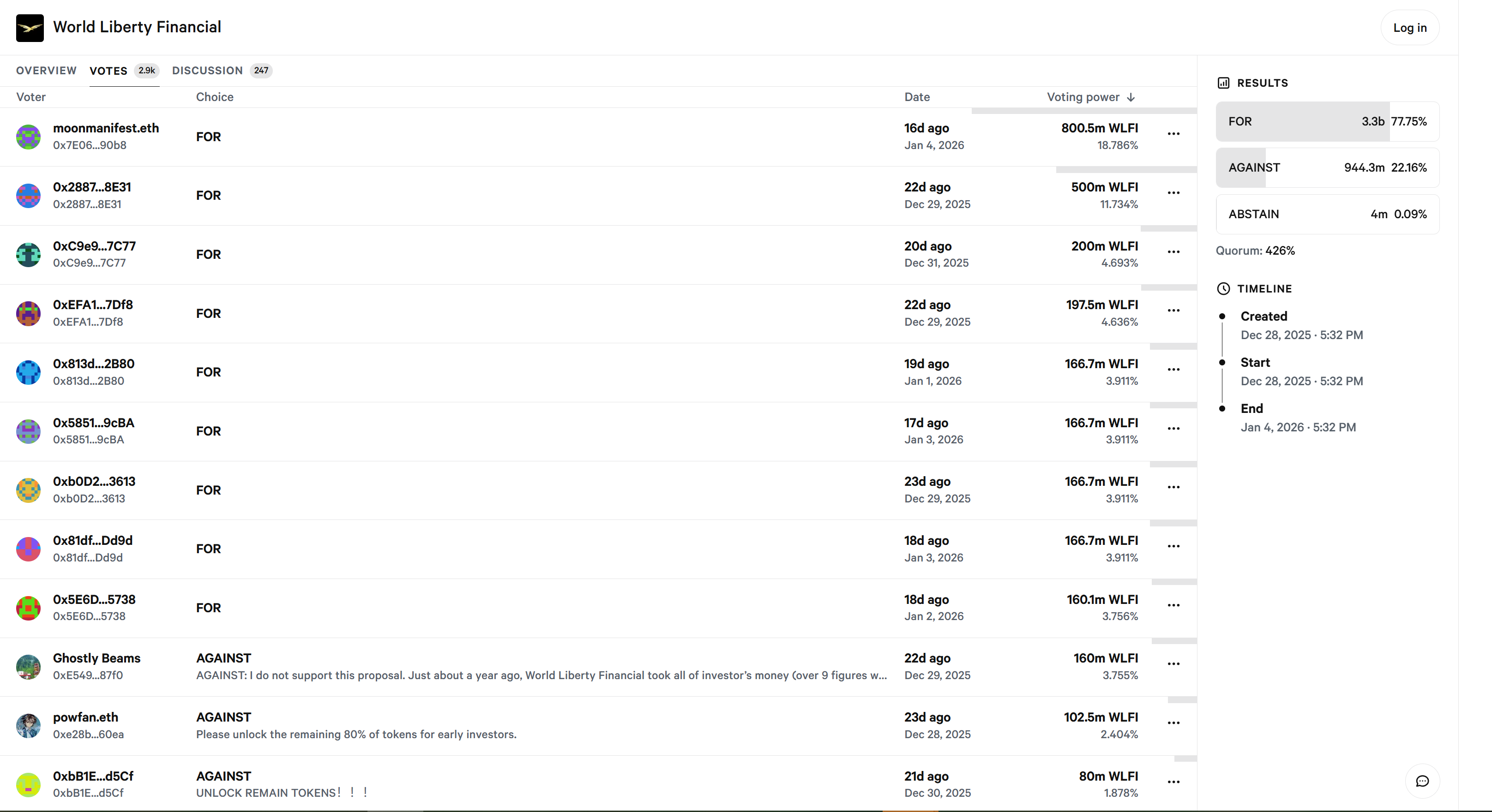 Проект World Liberty Financial (WLFI) подвергся критике после управленческого голосования, на котором был одобрен план по росту USD1, несмотря на возражения сообщества из‑за отсутствия возможности голосовать у держателей заблокированных WLFI.