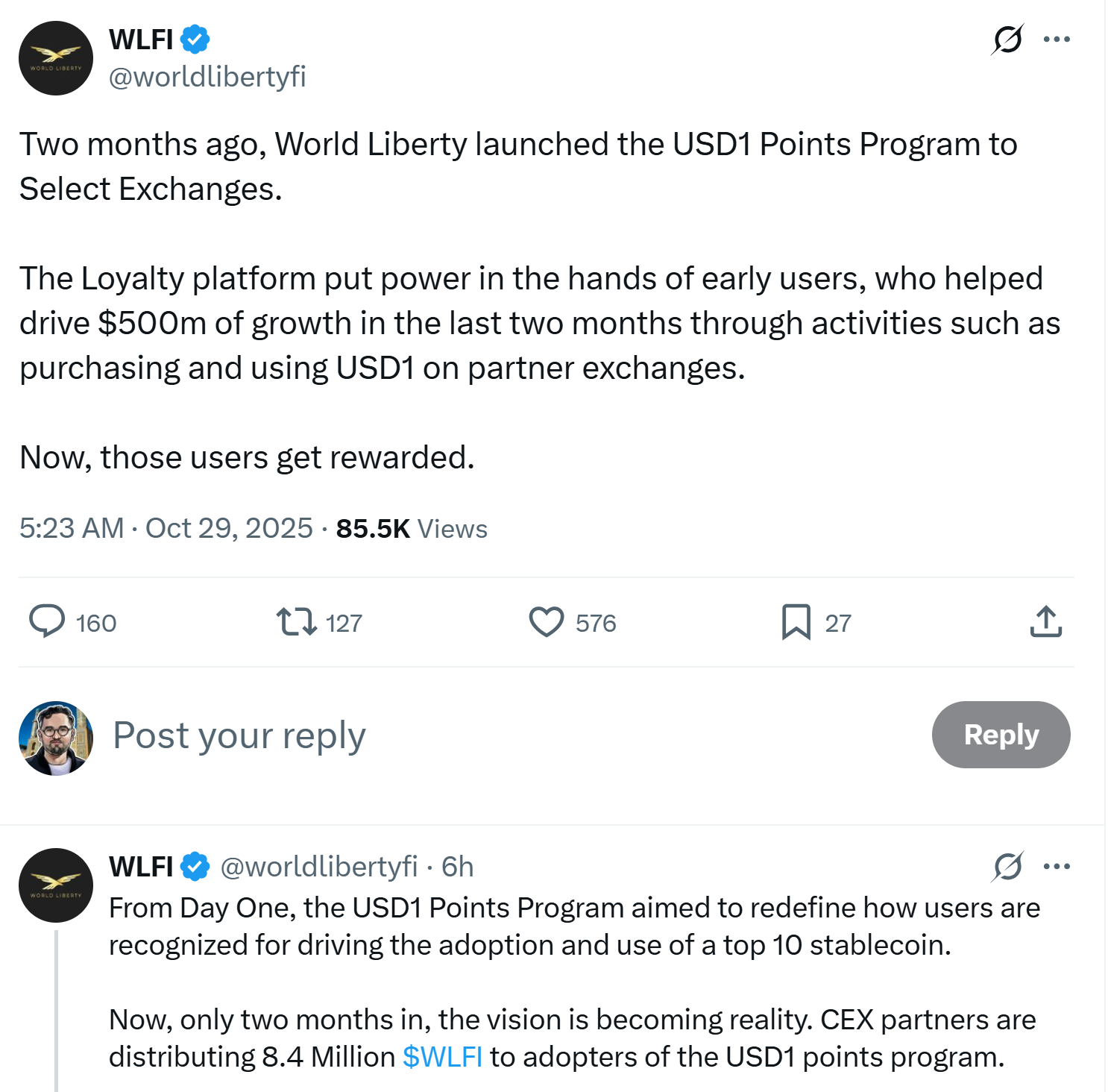 Раздача вознаградит пользователей, которые присоединились к программе USD1 Points, запущенной два месяца назад для содействия принятию стабильной монеты World Liberty, обеспеченной долларом США. Участники зарабатывали баллы, торгуя парами USD1 на партнерских биржах и поддерживая балансы.