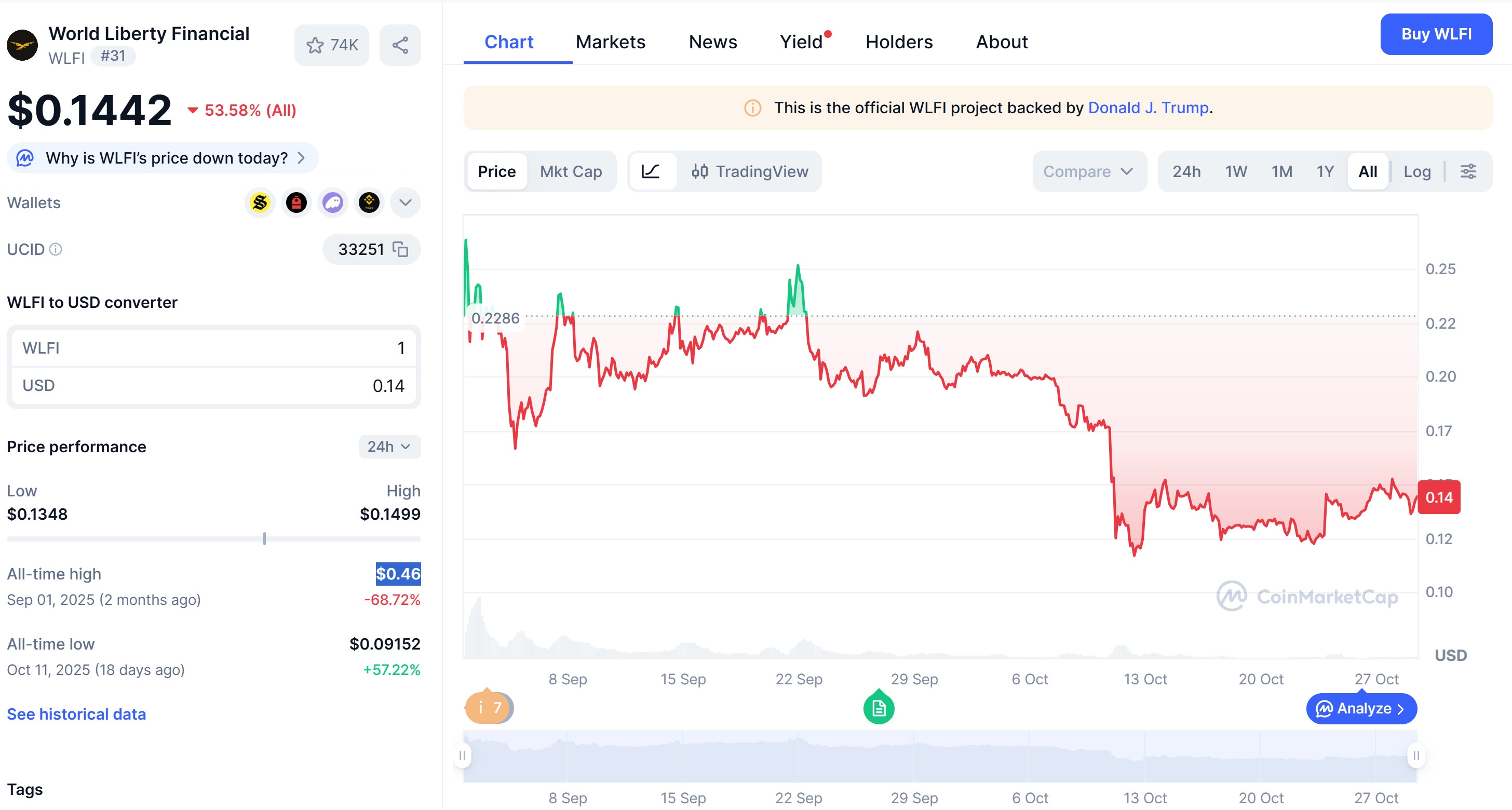 WLFI в настоящее время торгуется по $0,14, снижаясь на 0,5% за последние 24 часа, показывают данные CoinMarketCap. Токен упал почти на 70% с момента его максимума в $0,46, зарегистрированного в сентябре.