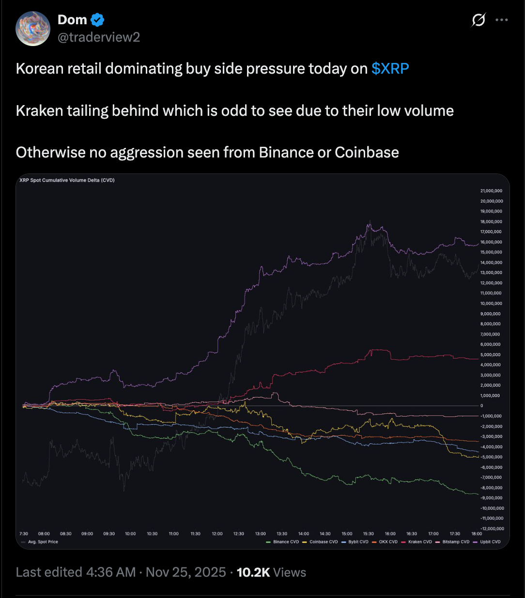 XRP снова отскакивает в знакомой зеленой зоне накопления, соблюдая более широкую структуру, сформировавшуюся ранее в 2025 году.