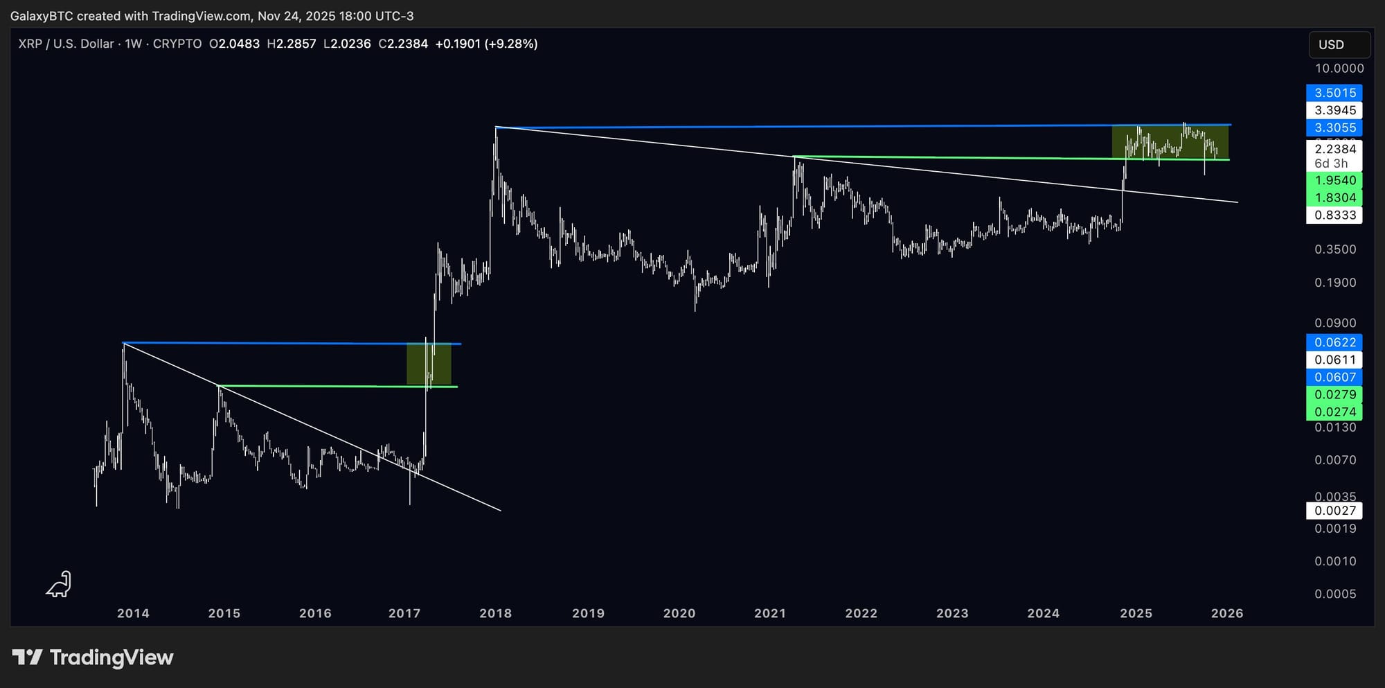 Скорректированные цены около $2 и возврат покупателей побудили GalaxyBTC предположить, что XRP может снова дойти до верхней границы около $3.30–$3.50, что отражает фазу расширения после аналогичной технической установки в 2017 году.