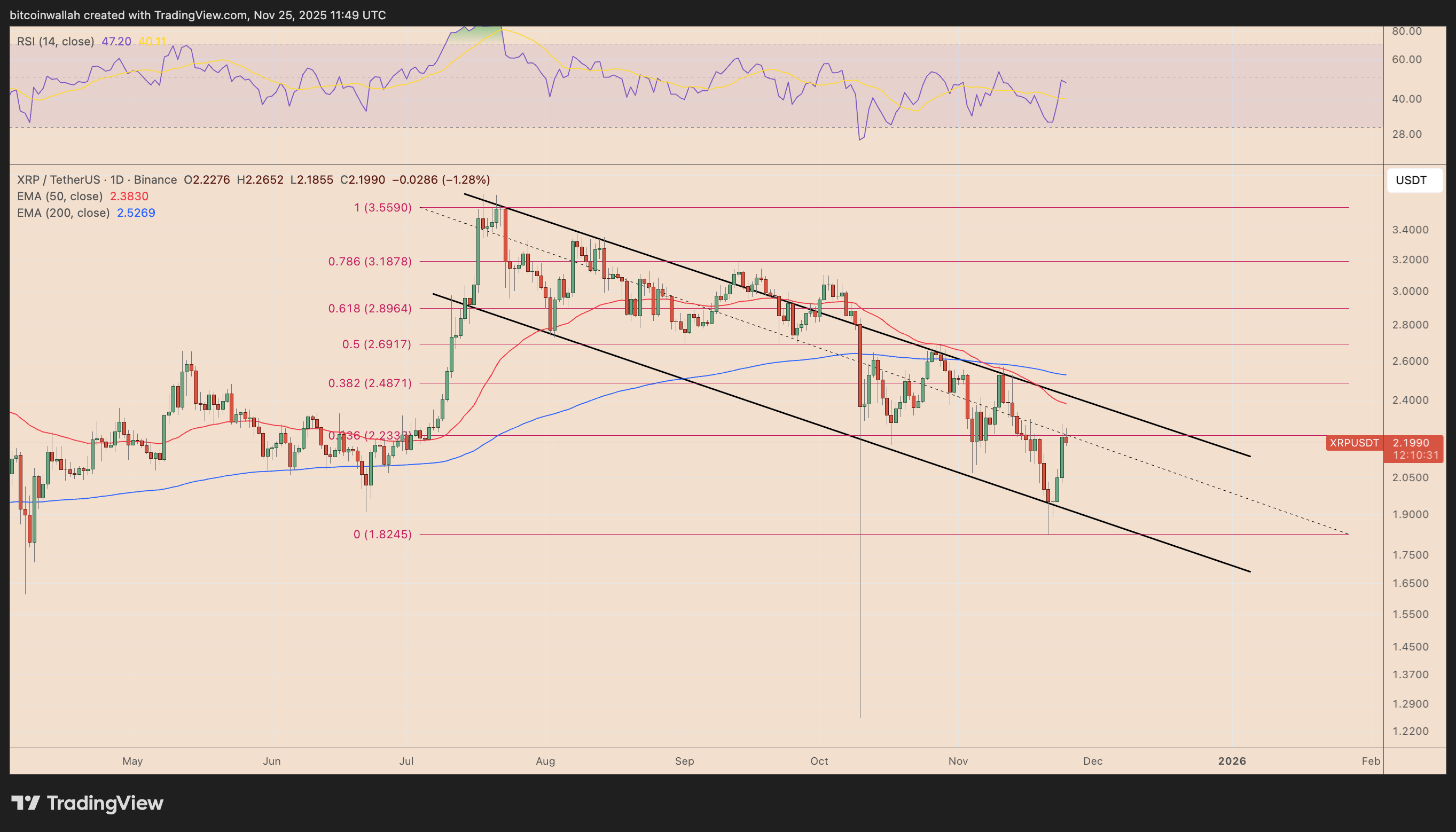 Тем не менее, эти EMA практически совпадают с верхней трендовой линией нисходящего канала XRP, который руководит снижением цен с лета.