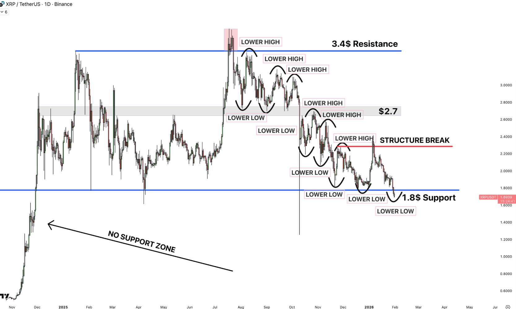 Псевдонимный аналитик AltCryptoGems в X заявил, что рост XRP к $2,40 в январе оказался «ложным выходом», а цена продолжила формировать новые более низкие минимумы.