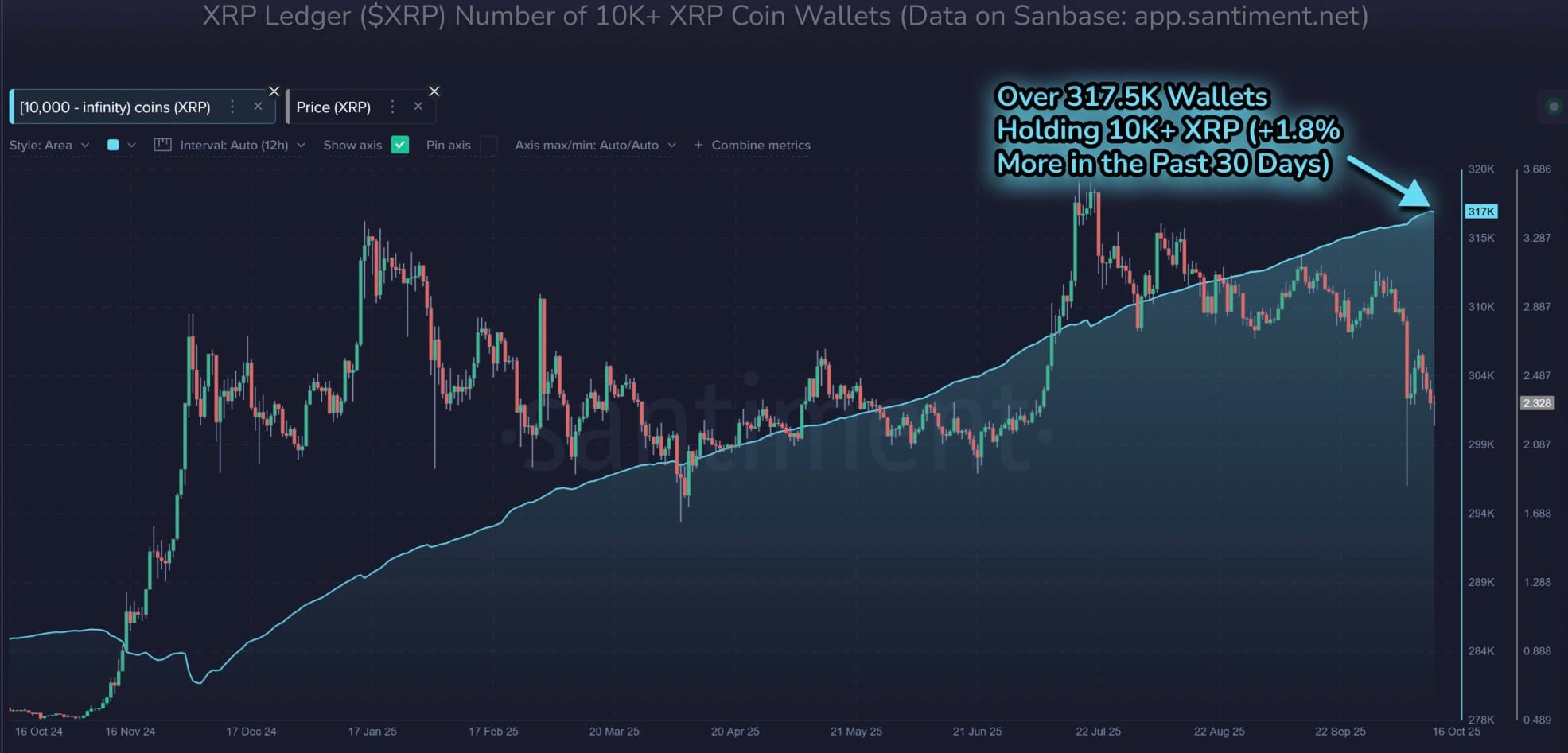 Согласно метрике Santiment, число кошельков, содержащих по крайней мере 10 000 XRP, достигло рекордного уровня в 317 500.