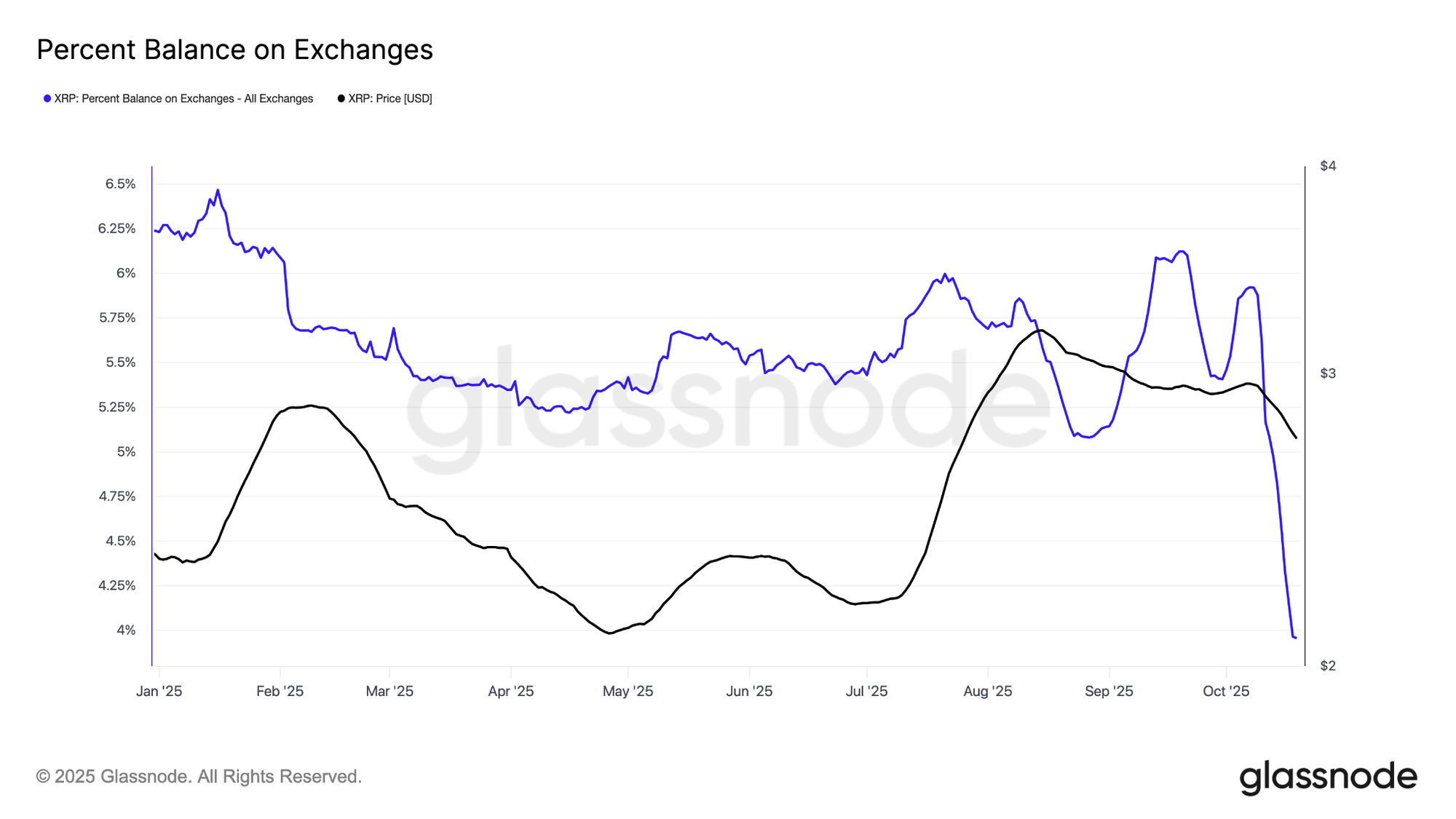 График ниже показывает, что процент предложения XRP на биржах упал до 3,9% с 6,12% в период с 19 сентября по 19 октября.