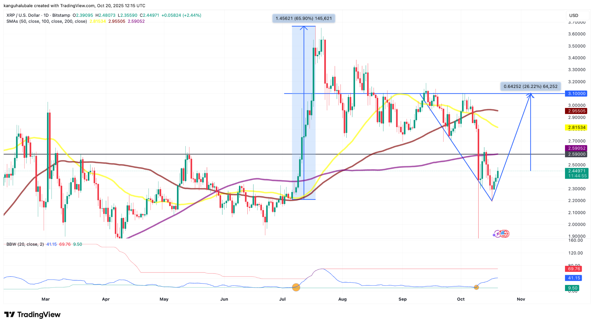 - Сначала цена XRP должна преодолеть сопротивление на уровне $2,59, чтобы восстановить уровень $3.