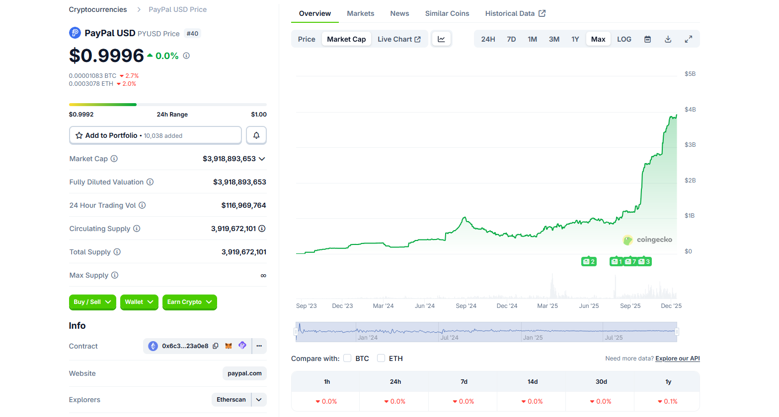 PYUSD была запущена в середине 2023 года и на текущий момент имеет рыночную капитализацию в $3,9 миллиарда согласно данным CoinGecko. С начала года ее рыночная стоимость резко увеличилась с примерно $500 миллионов в январе.