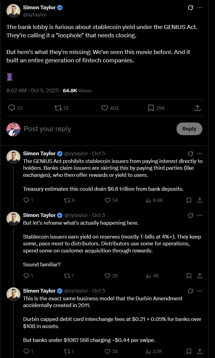 Критика Армстронга в отношении банковской индустрии совпадает с противодействием лоббистов закону о стабильных монетах GENIUS, особенно из-за того, что они считают лазейкой, позволяющей выплачивать проценты.