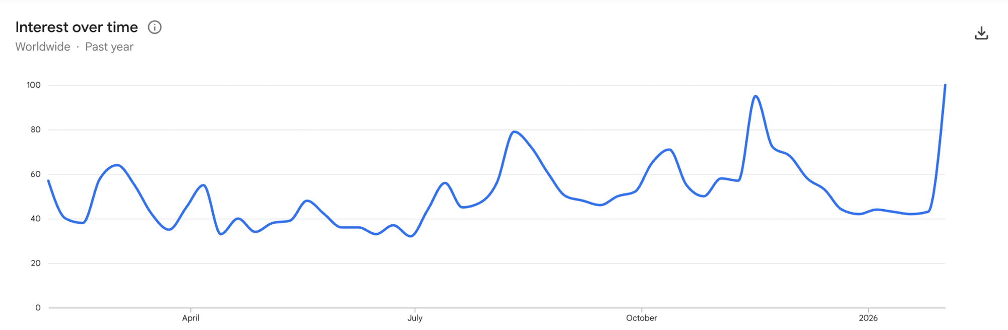 По предварительным данным Google Trends, по всему миру интерес к запросу «Bitcoin» достиг отметки 100 в неделю, начавшуюся 1 февраля — это максимум за последние 12 месяцев.