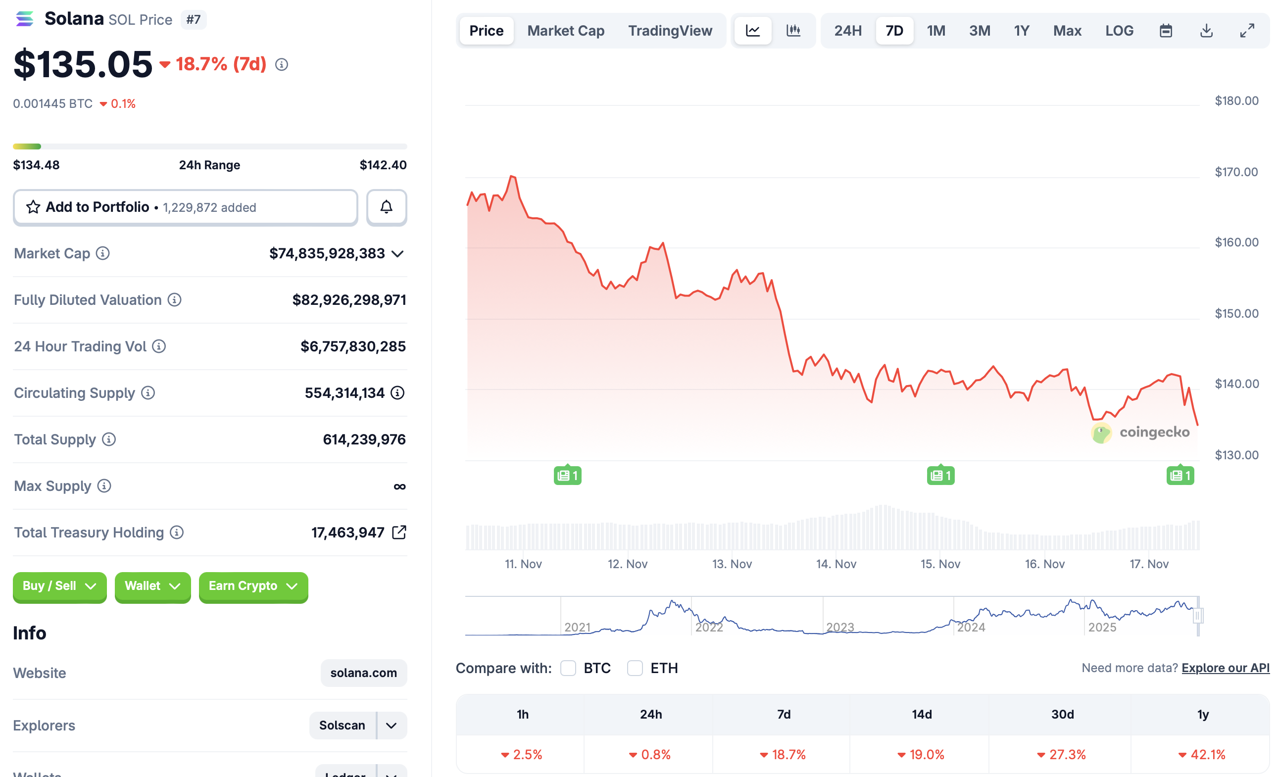 Несмотря на повышенный регулируемый доступ к стейкинговым вознаграждениям Solana, цена SOL испытывает трудности в последнее время. На момент написания, SOL торговался примерно по $135 за токен, что на 19% ниже за последние две недели, согласно данным от CoinGecko.