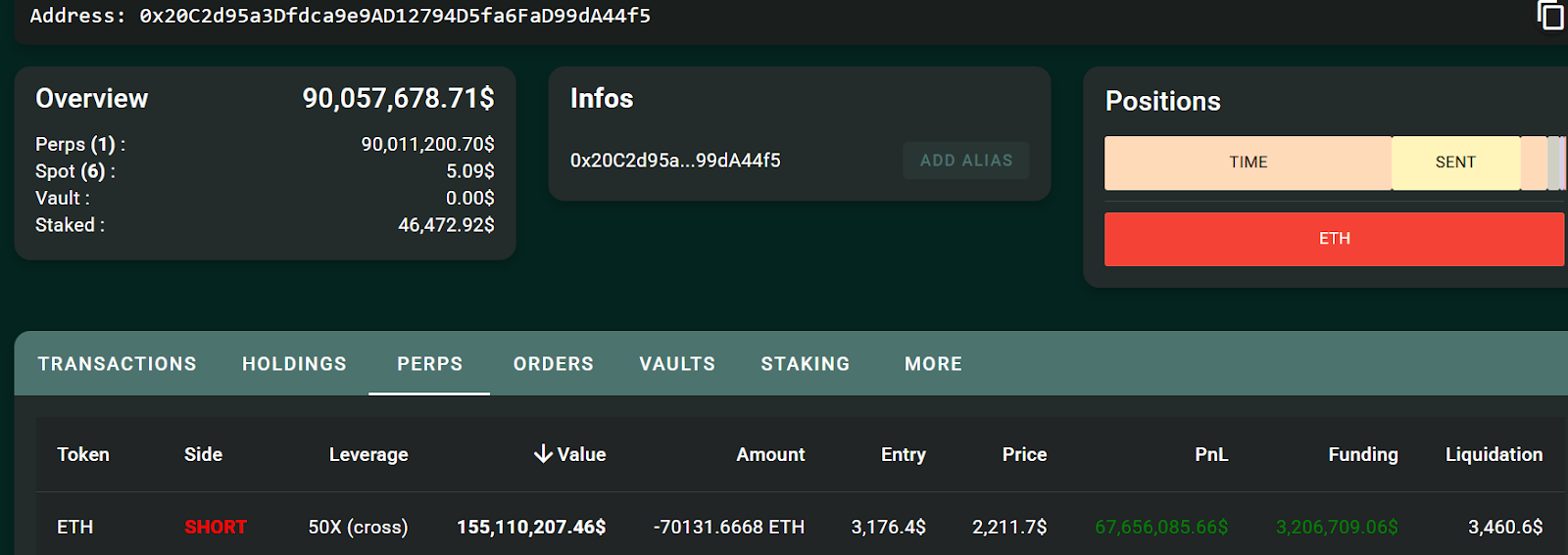 Согласно данным блокчейна от Hypurrscan, трейдер открыл короткую позицию с кредитным плечом 50x, когда Ether (ETH) торговался по цене $3,176. На 9:06 утра по UTC 5 марта прибыль по позиции составляла почти $68 миллионов.