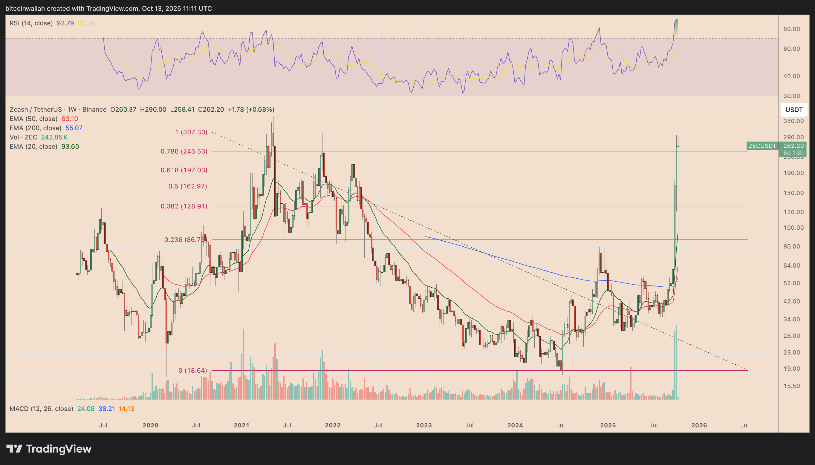 По состоянию на понедельник, недельный индекс относительной силы ZEC (RSI) превышает 92, что является рекордным уровнем.