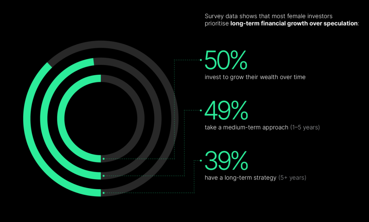 Согласно опросу, 50% женщин-инвесторов в криптовалюту уделяют первоочередное внимание долгосрочному финансовому росту. Из них 49% держат цифровые активы до пяти лет, а 39% планируют удерживать более пяти лет.