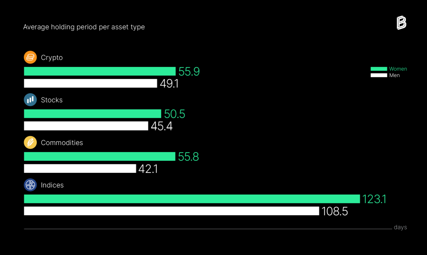 Средний период удержания активов мужчинами и женщинами. Источник: Bitpanda